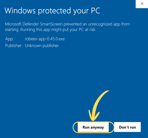 After clicking "More info," a new button (usually labeled "Run anyway") will appear at the bottom of the window. Click the new "Run anyway" button to proceed with the installation of the RoBeeX application.