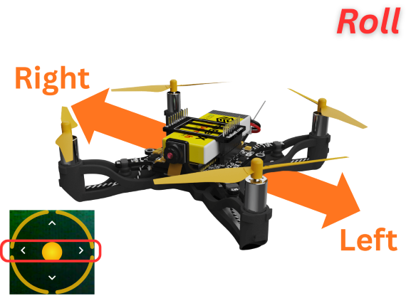 Roll controls the side-to-side (lateral) movement of the drone. The drone slightly tilts its body to the left or right to create a sideways thrust.