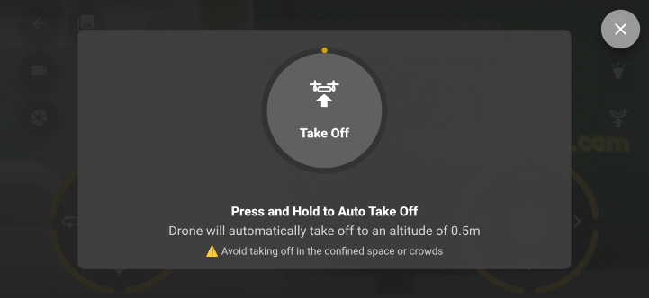 - Execution: Press and hold the central "Take Off" button until the yellow circle indicator is complete (the yellow circle around the button fills up).