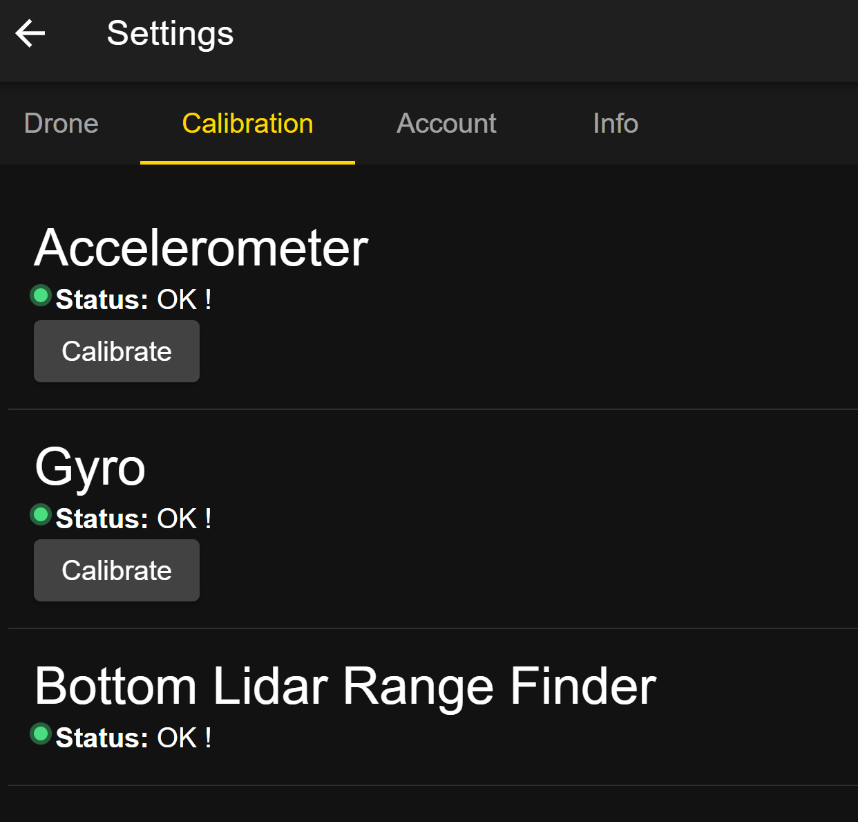 | Bottom Lidar Range Finder | 🟢 Status: OK ! (Usually) | (No Button) | Status check for the sensor used for precision altitude holding and safe landing. This sensor typically does not require user calibration. |