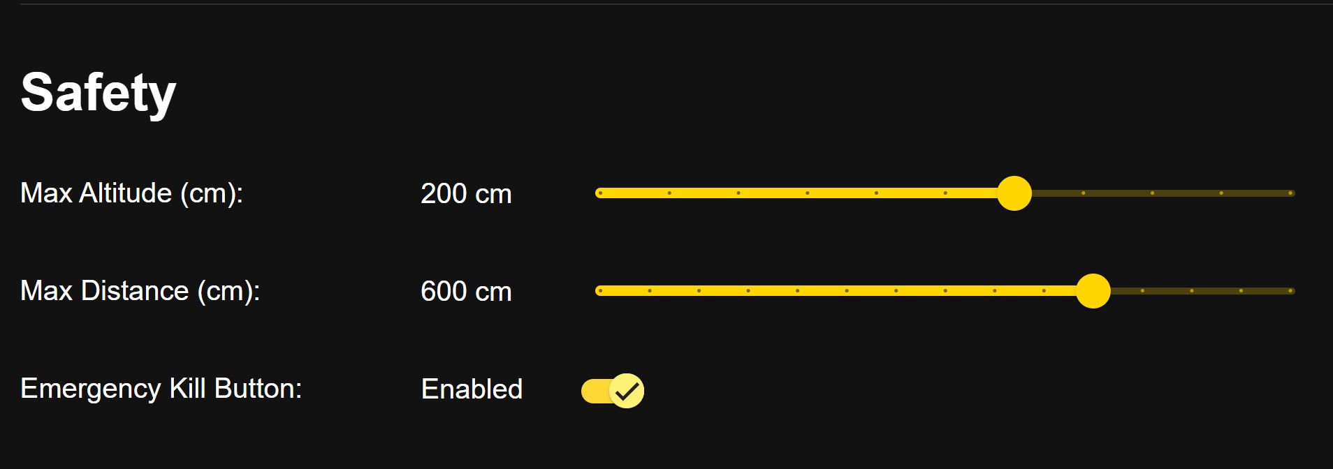 | Max Altitude (cm) | Sets the absolute maximum height the drone is allowed to fly. The maximum limit is 300cm(3 meters) above the surface below the drone at any given moment during flight. | Slider |