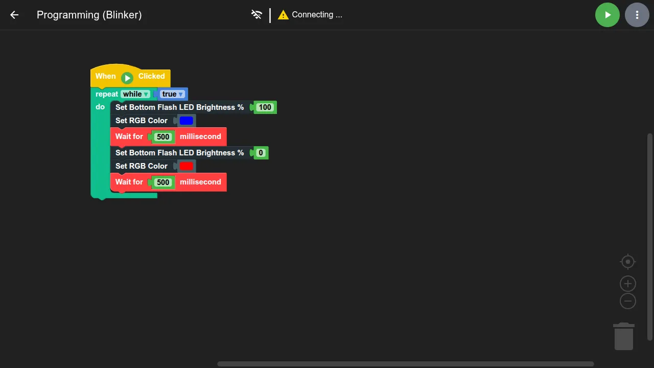 Observe: Your RoBeeX device's main LED should immediately begin blinking and changing colors as defined by the program blocks.